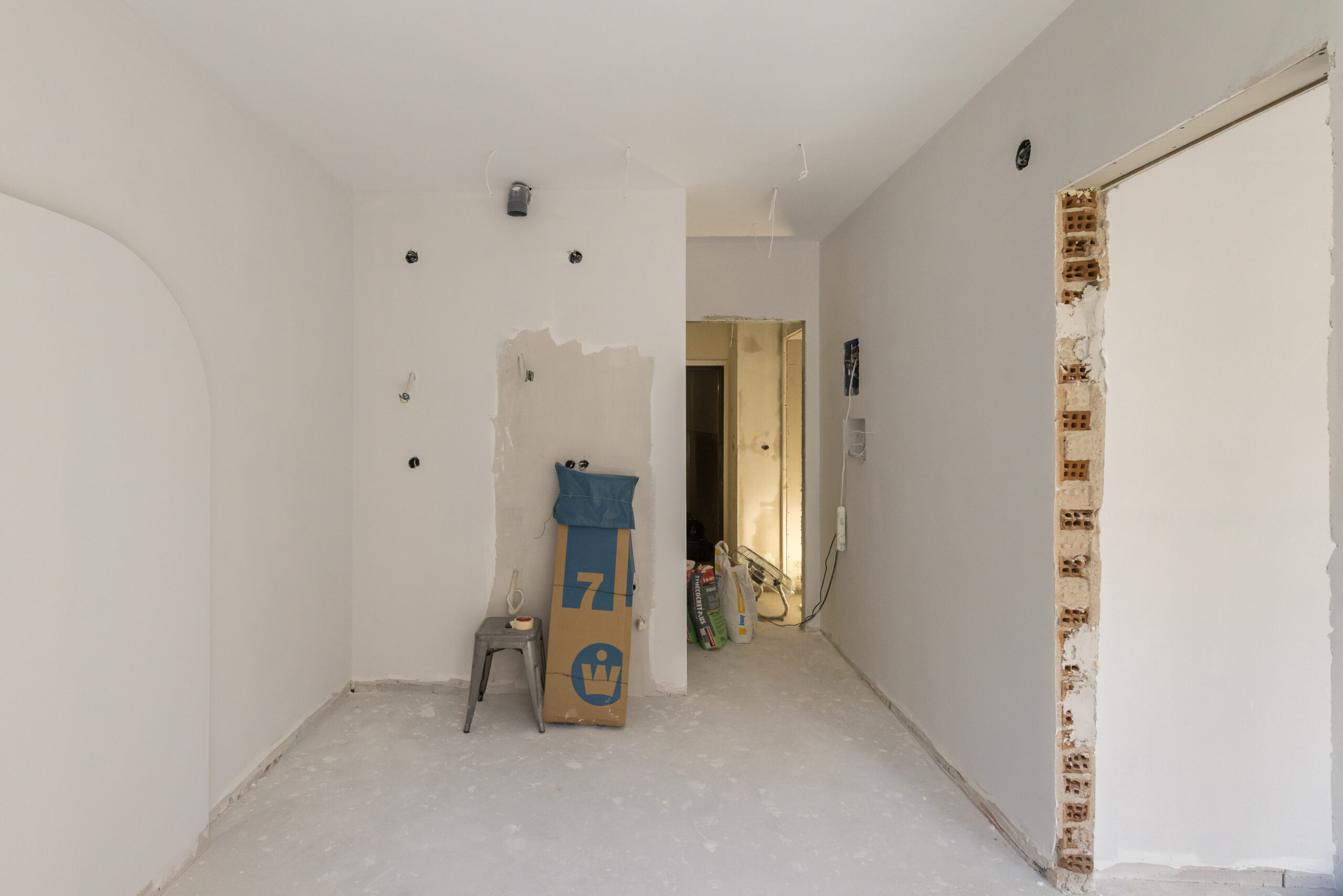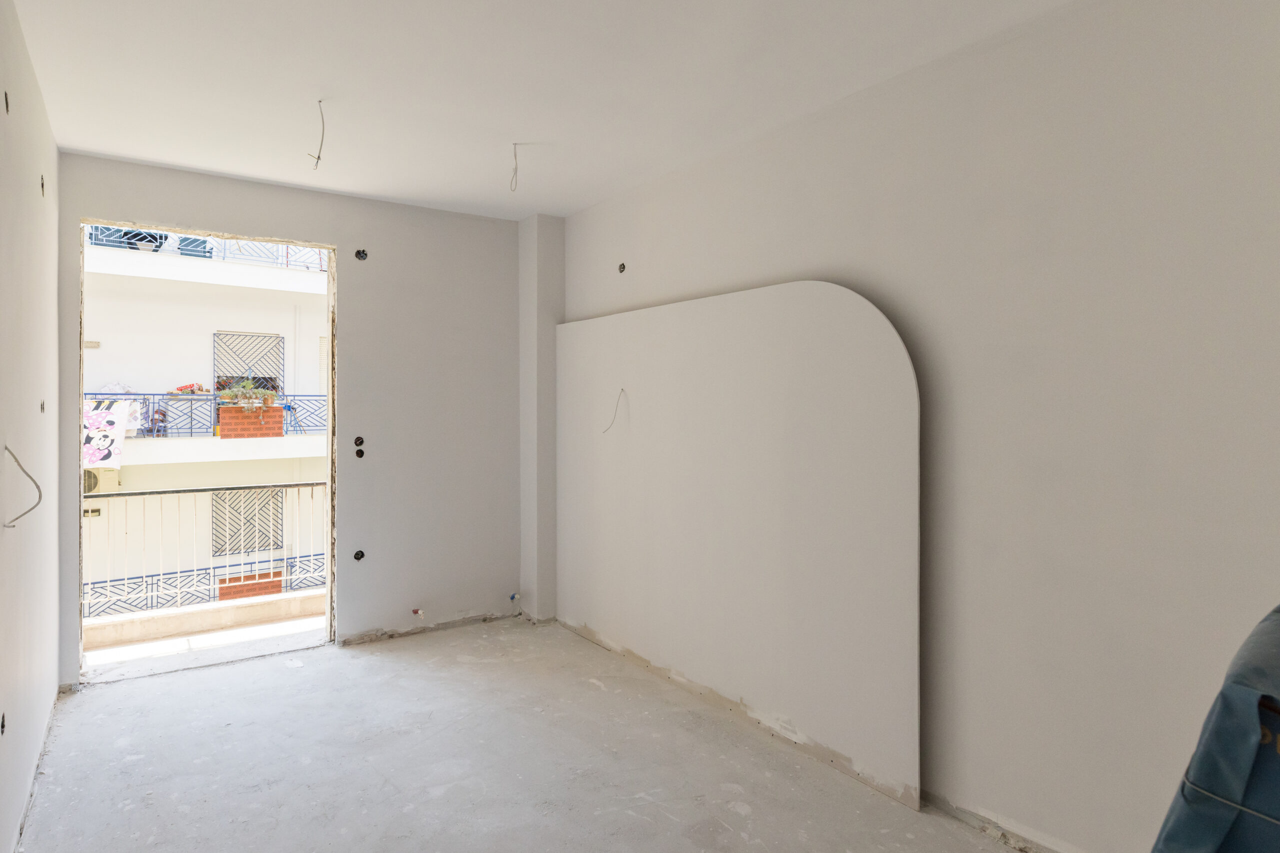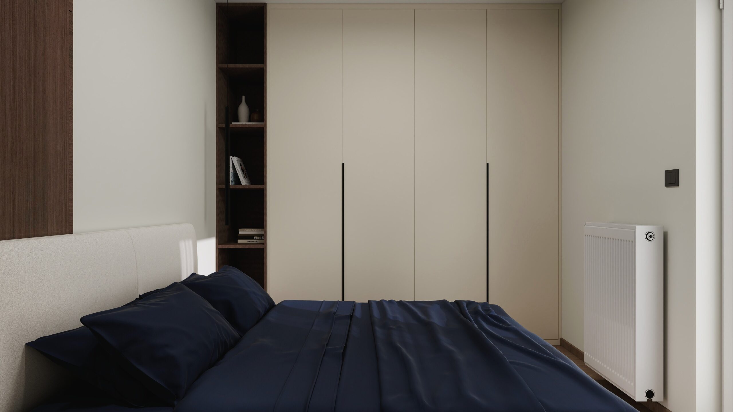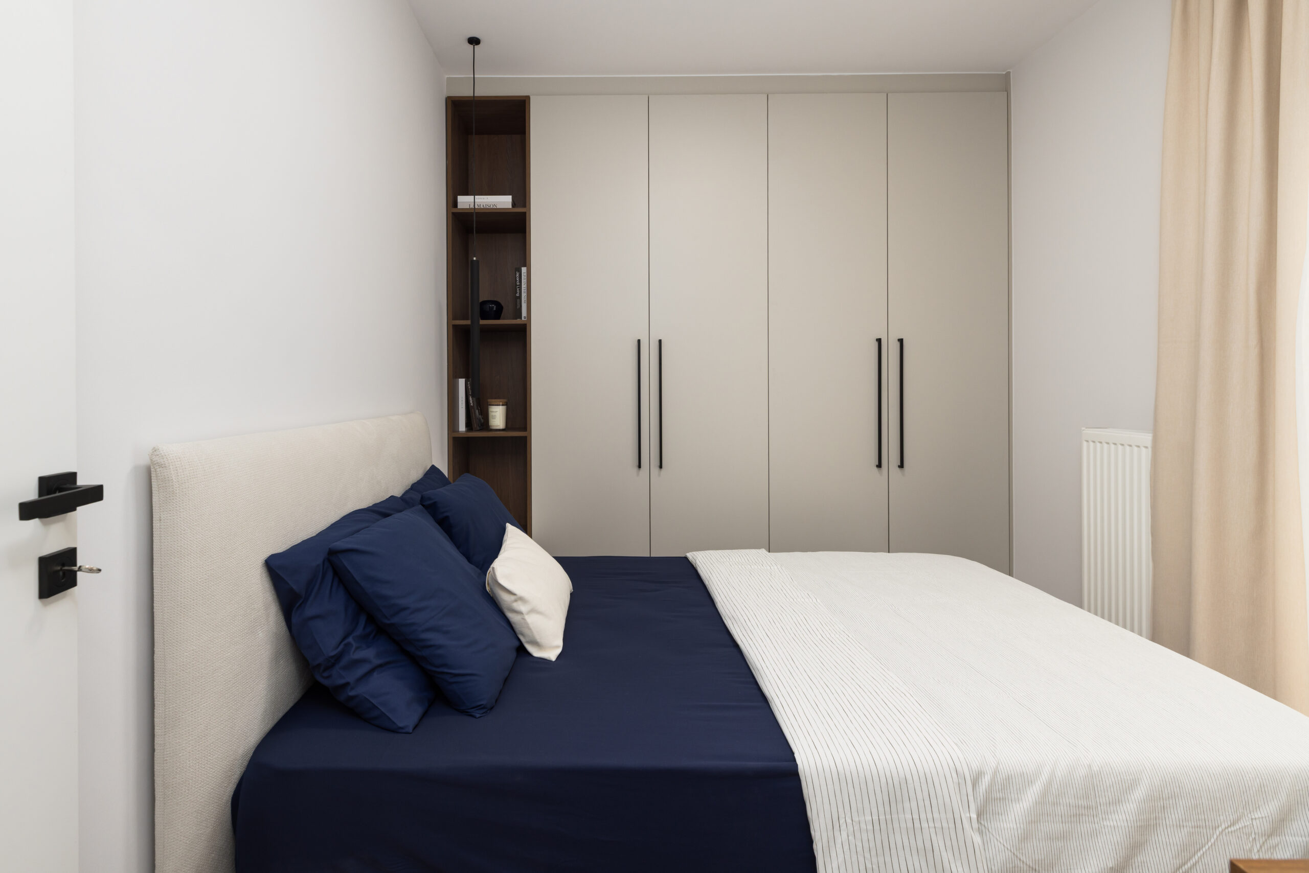 Επίκεντρο του σχεδιασμού μας ήταν η navy blue παλέτα, η οποία συνδυάστηκε με απαλά ουδέτερα χρώματα, δημιουργώντας ένα ισορροπημένο και σύγχρονο αποτέλεσμα. Οι καμπύλες φόρμες και οι custom κατασκευές από γυψοσανίδα, όπως οι χαρακτηριστικές καμάρες στις βιβλιοθήκες, προσθέτουν έναν ήπιο αρχιτεκτονικό ρυθμό που προσφέρει οπτικό βάθος. Στους τοίχους εφαρμόστηκε ανάγλυφη πατητή τεχνοτροπία, ενισχύοντας την αίσθηση υφής και ζεστασιάς.