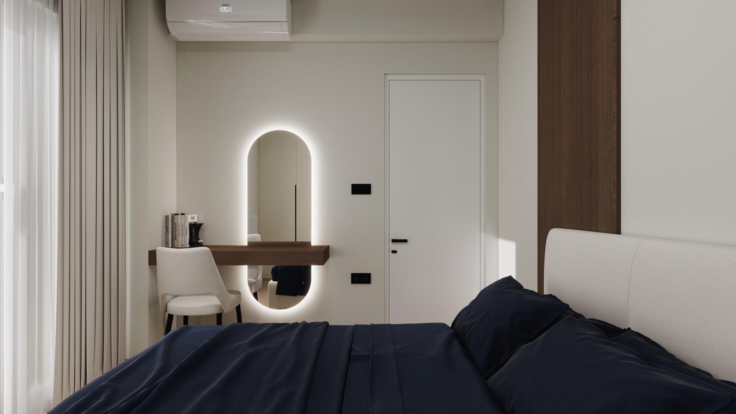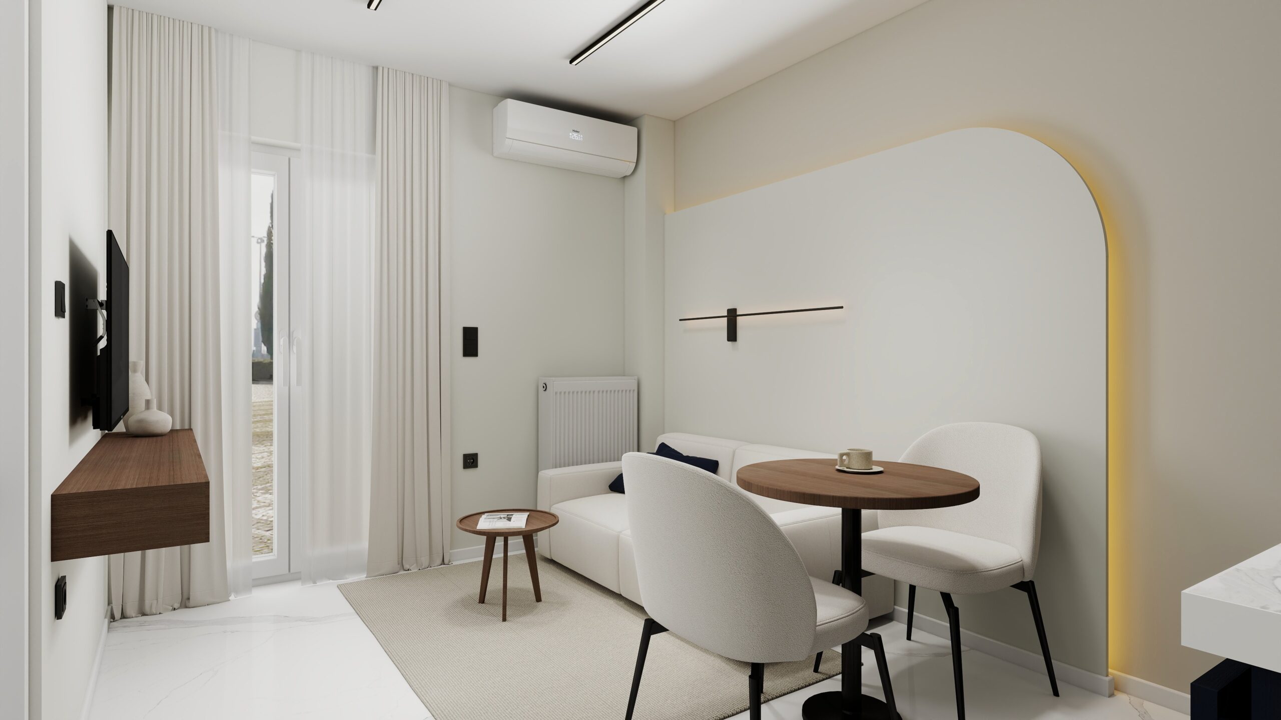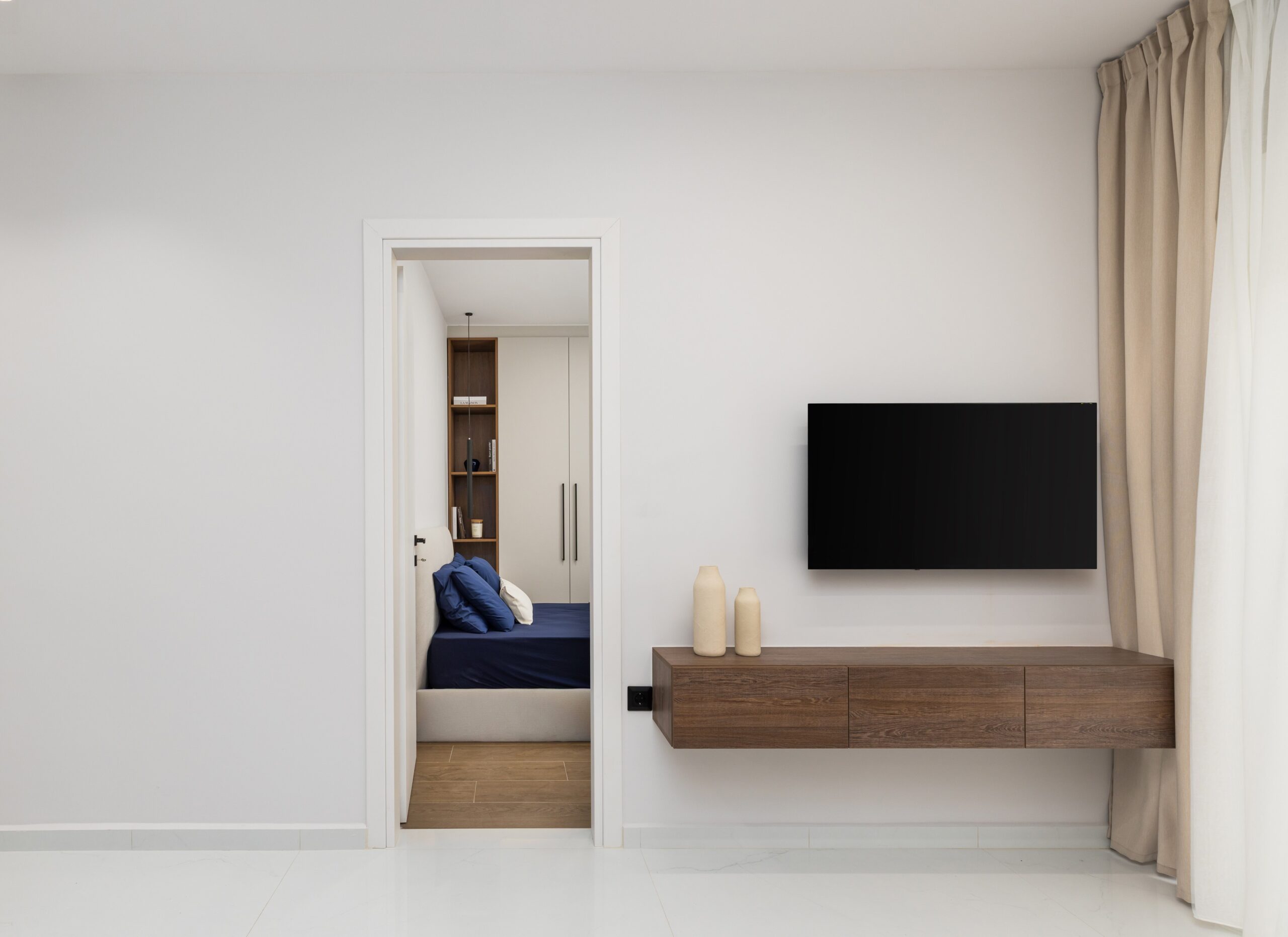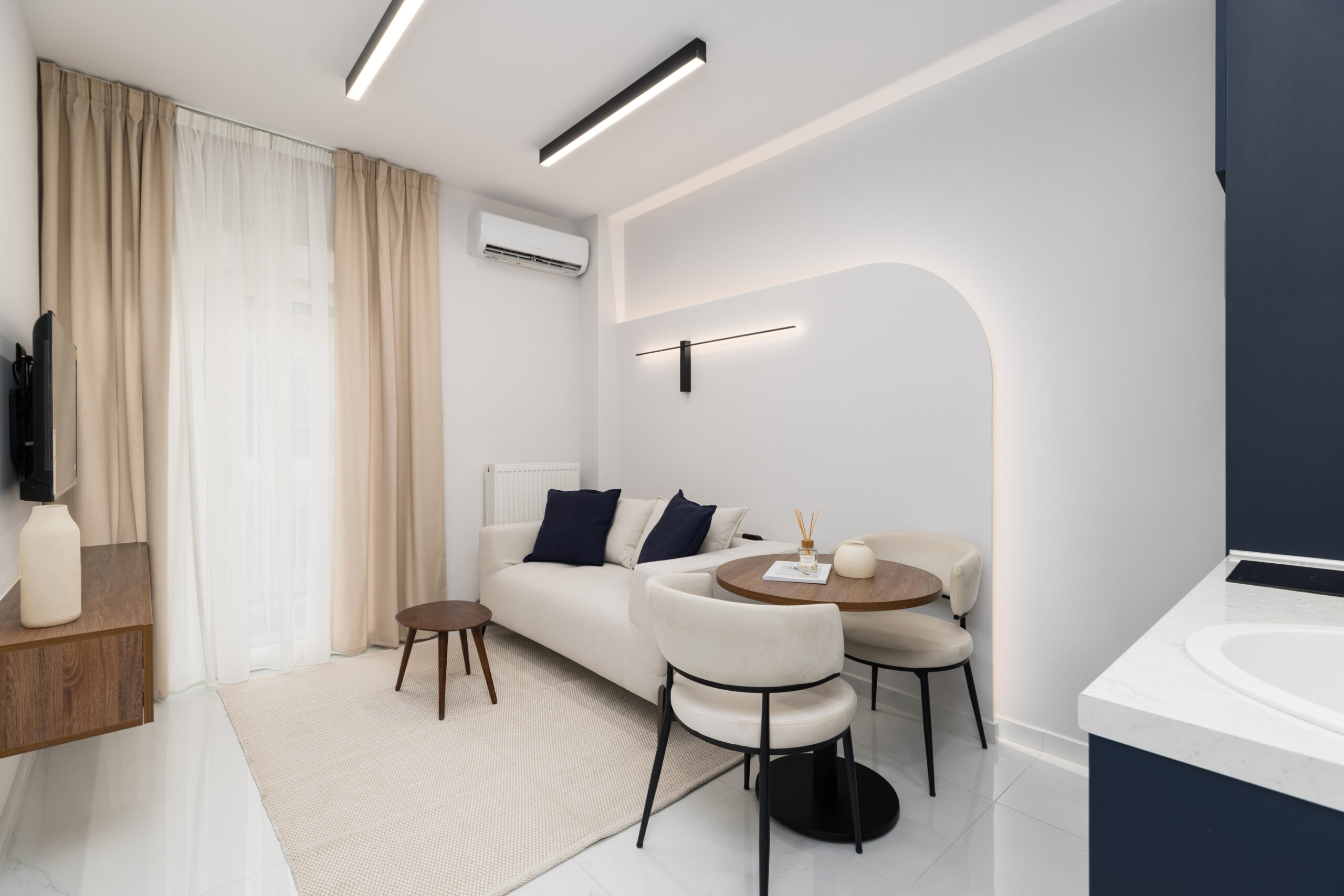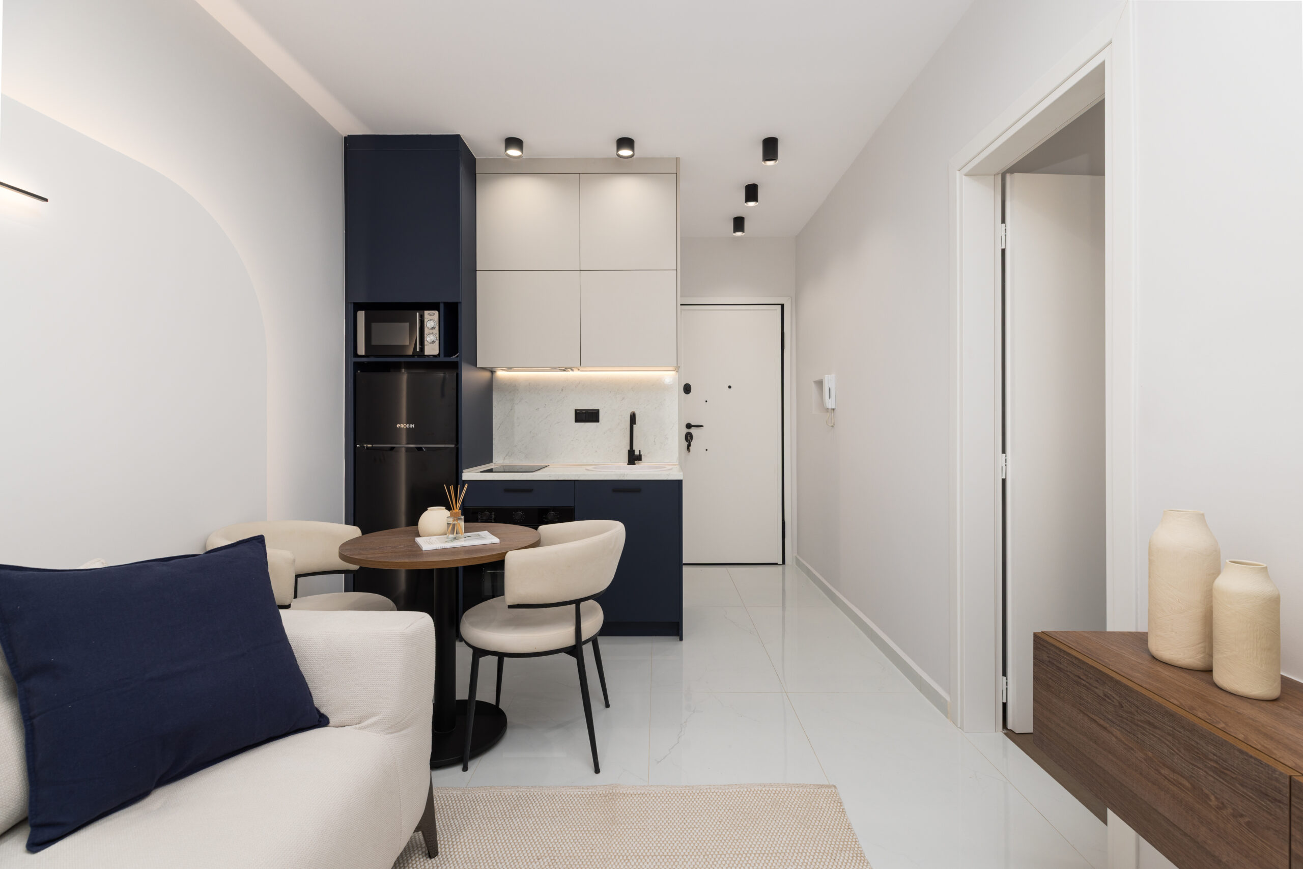 Οι κουζίνες σχεδιάστηκαν με minimal λογική και λειτουργική διάταξη, ενώ τα υπνοδωμάτια ακολουθούν την ίδια αισθητική, με καθαρές γραμμές και διακριτικό φωτισμό που ενισχύει την ηρεμία του χώρου.