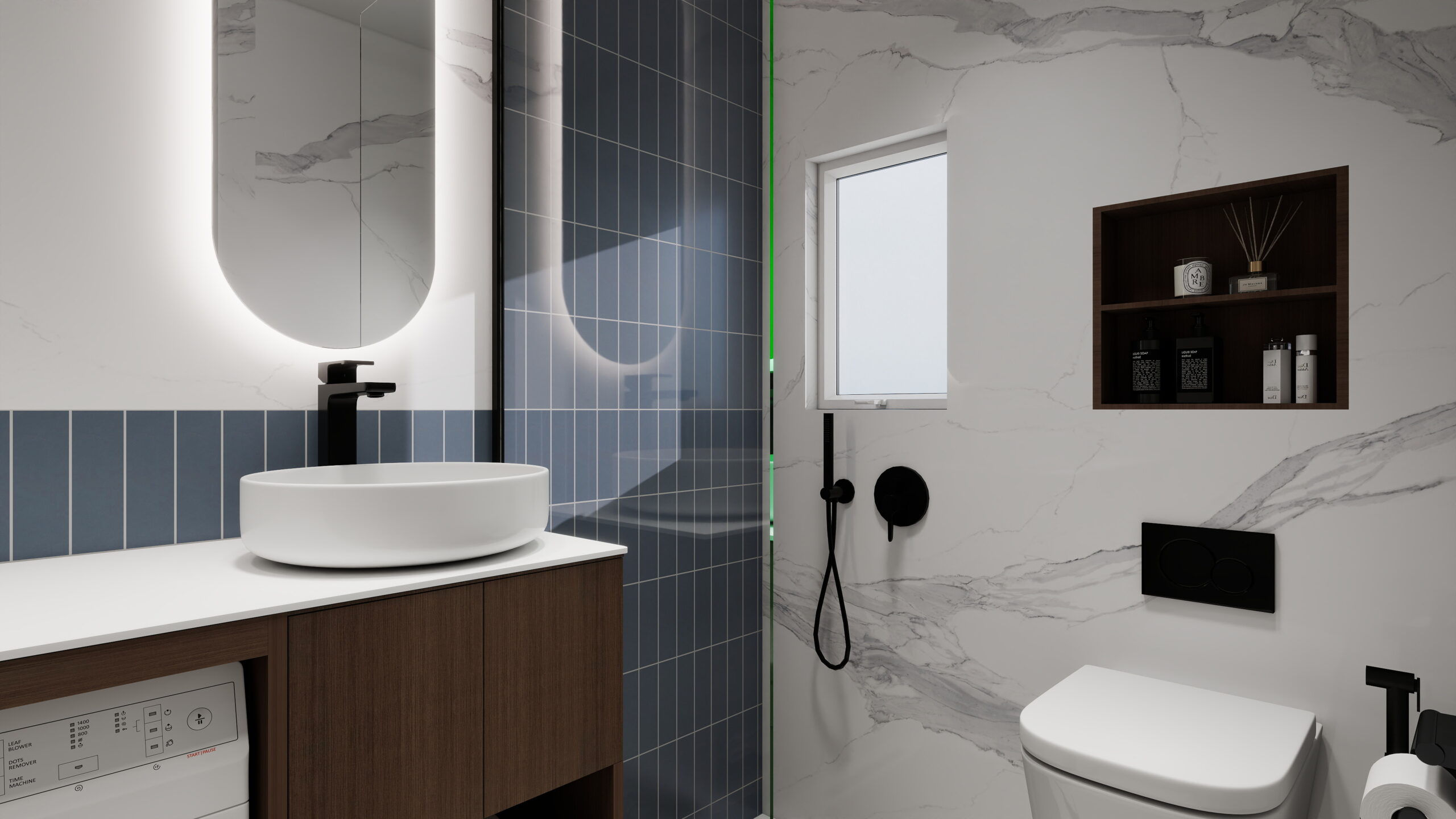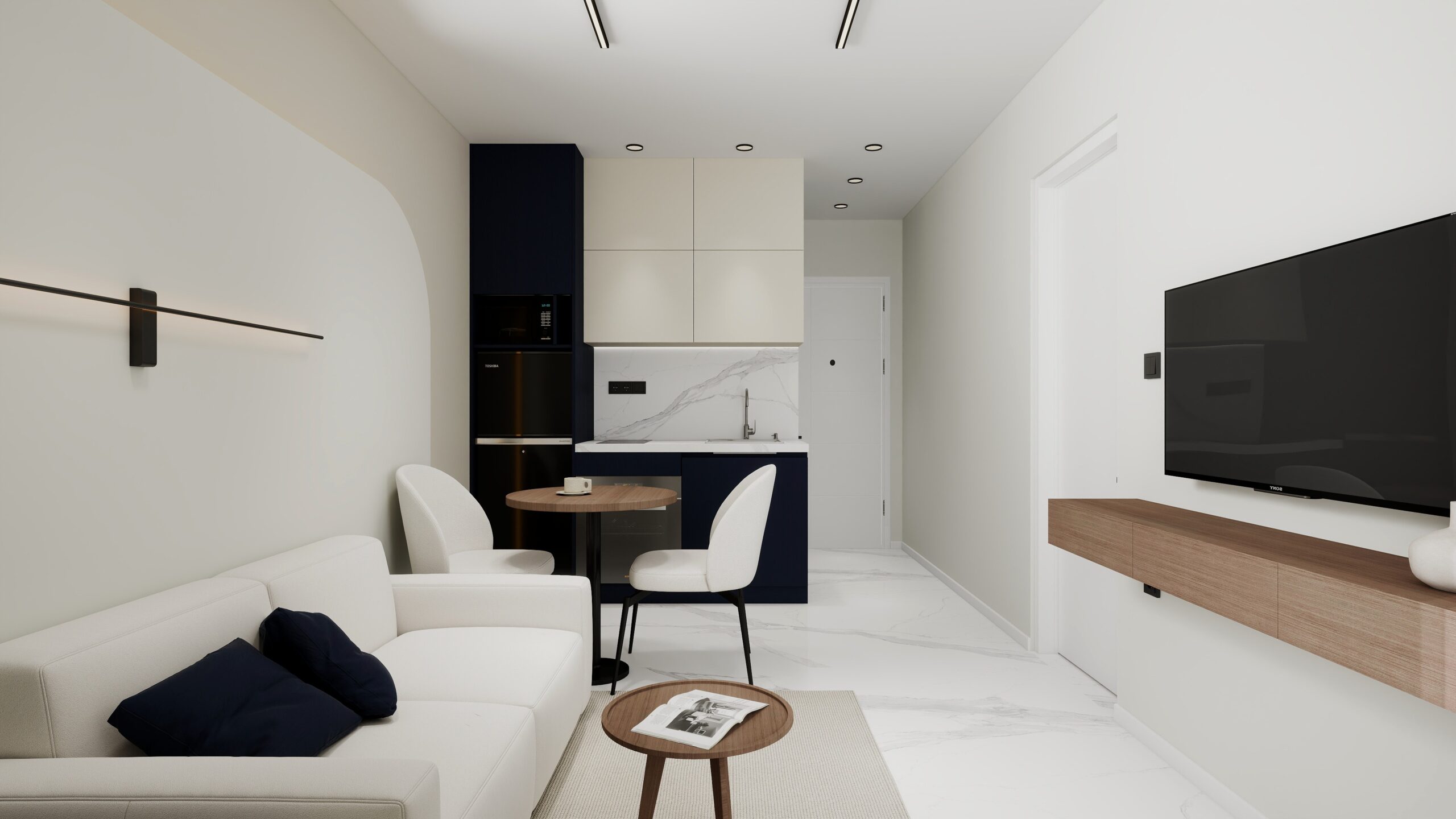 Aναδιαμόρφωση ενός μεγάλου διαμερίσματος σε 2 αυτόνομες, λειτουργικές και σύγχρονες γκαρσονιέρες, με έμφαση σε navy blue τόνους, καμπύλες γραμμές και οργανικές φόρμες.