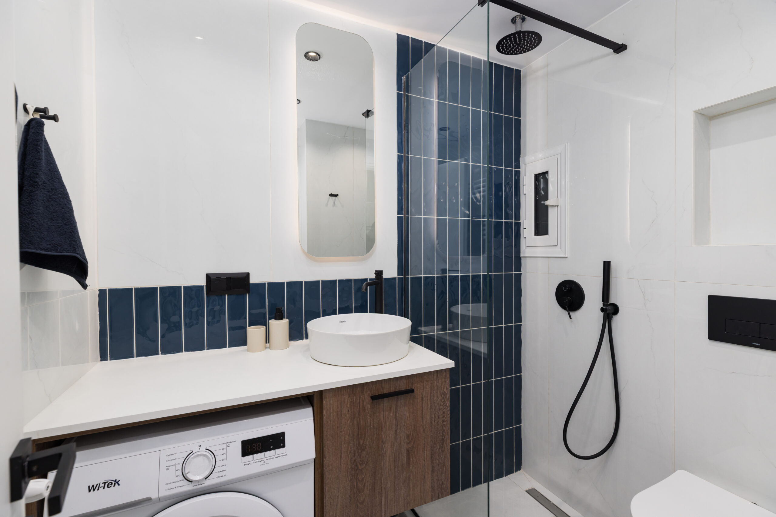 Στο μπάνιο, επιλέχθηκαν μακρόστενα πλακιδία τοποθετημένα κάθετα, προσφέροντας έτσι ύψος και έναν σύγχρονο χαρακτήρα.
